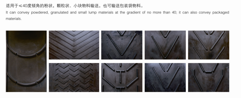 花紋輸送帶是由帶體和花紋部分組成,由于運輸物料不同和輸送機傾角大小,要求花紋形狀和高低深淺也不同。適用于輸送傾角≤40度的粉狀、顆粒狀、小塊物料,也可輸送包裝袋物料。